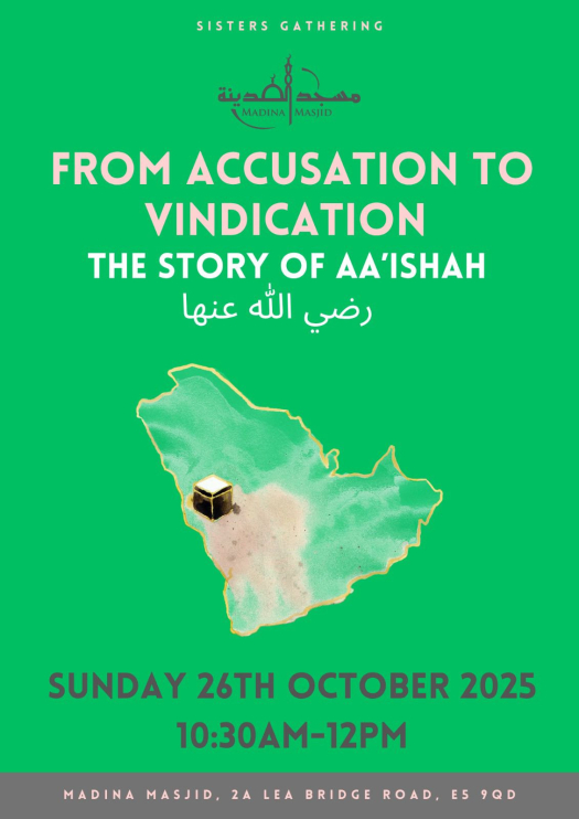 Madina Masjid invites sisters to a special gathering titled “From Accusation to Vindication – The Story of Aa’ishah رضي الله عنها.”