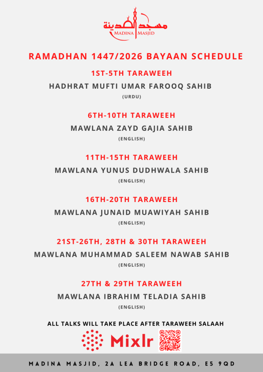 Subject to Ramadhan Dates, bayaans will take place after Taraweeh Salaah