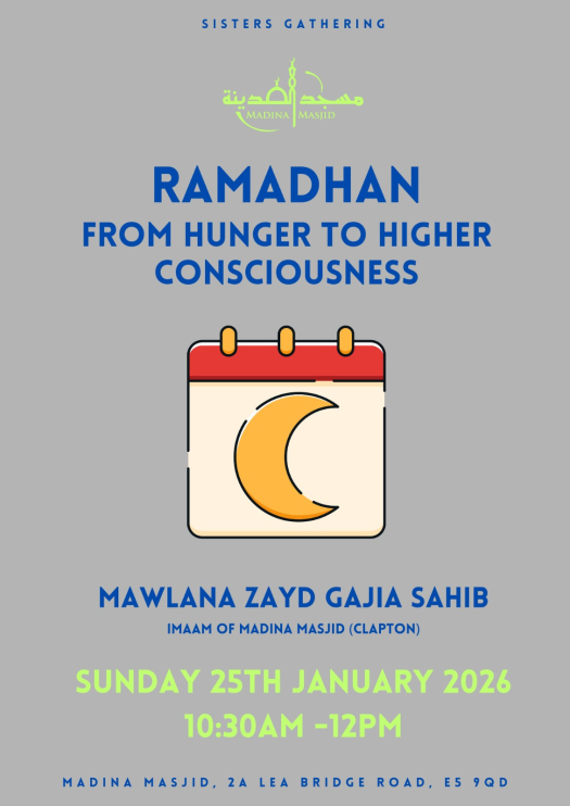 Delivered by Mawlana Zayd Gajia Sahib, Imam of Madina Masjid (Clapton), this session will reflect on the deeper purpose of fasting — transforming the experience of hunger into a journey of self-discipline, awareness, and closeness to Allah.