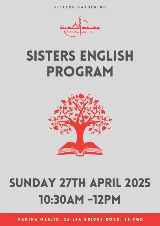 Madina Masjid invites all sisters to a Sisters English Program on Sunday, 27th April 2025, from 10:30 AM to 12:00 PM. This program will provide an opportunity for sisters to come together and engage in meaningful discussions, reflections, and learning in English.