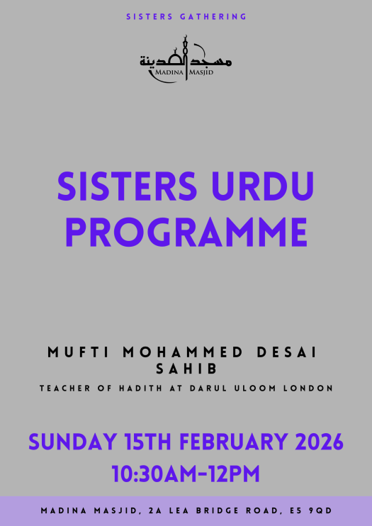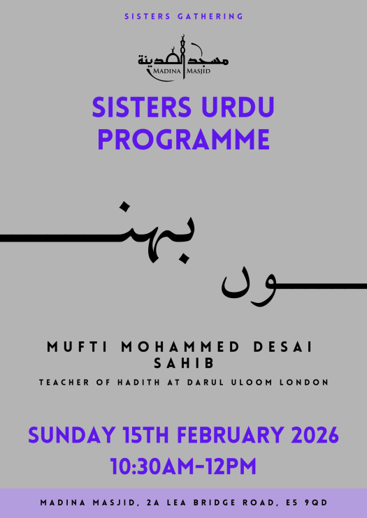 Madina Masjid invites all sisters to attend a special Sisters Urdu Programme featuring Mufti Mohammed Desai Sahib, taking place on Sunday, 15th February 2026, from 10:30am to 12:00pm.