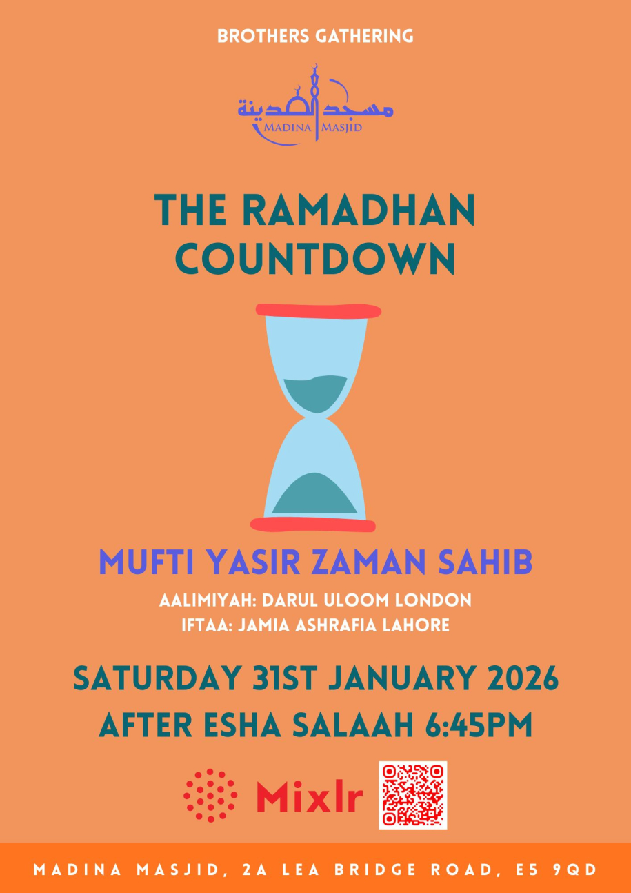Madina Masjid invites all brothers to attend "The Ramadhan Countdown", a special pre-Ramadhan gathering with Mufti Yasir Zaman Sahib, taking place on Saturday, 31st January 2026, after Esha Salaah at 6:45 PM.