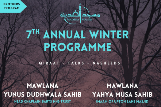 Madina Masjid is pleased to host its 7th Annual Winter Programme on Wednesday, 31st December 2025, starting after Esha Salaah at 8:30 PM.